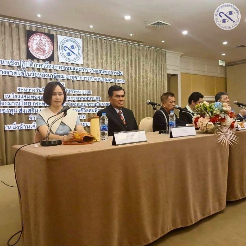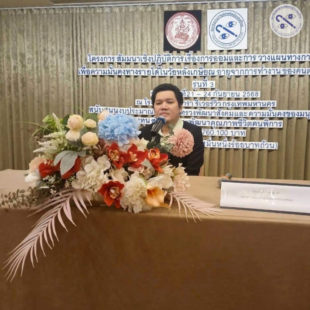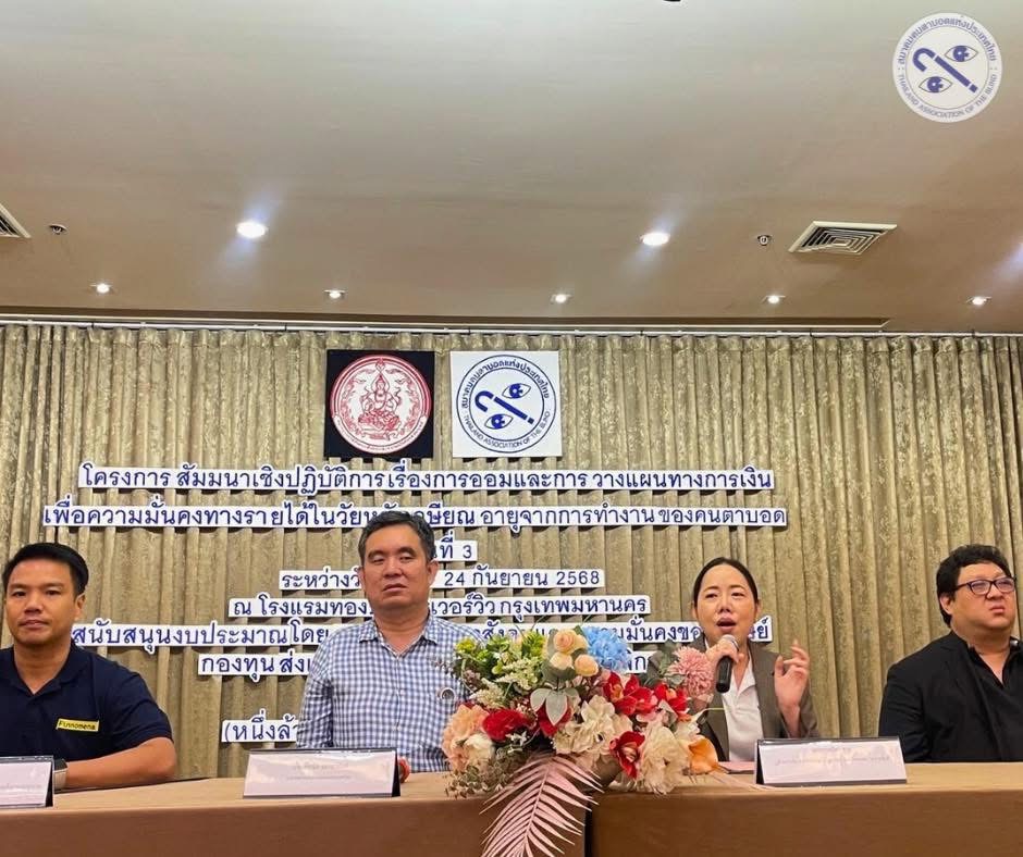 สมาคมคนตาบอดแห่งประเทศไทย จัดโครงการสัมมนาเชิงปฏิบัติการเรื่อง “การออมและการวางแผนทางการเงินเพื่อความมั่นคงทางรายได้ในวัยหลังเกษียณอายุจากการทำงานของคนตาบอด” รุ่นที่ 3ระหว่างวันที่ 21 – 24 กันยายน 2568 ณ โรงแรมทองธารา กรุงเทพมหานคร