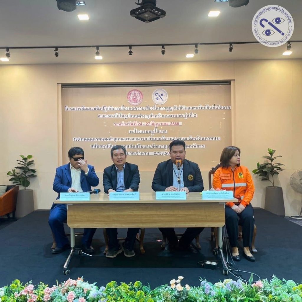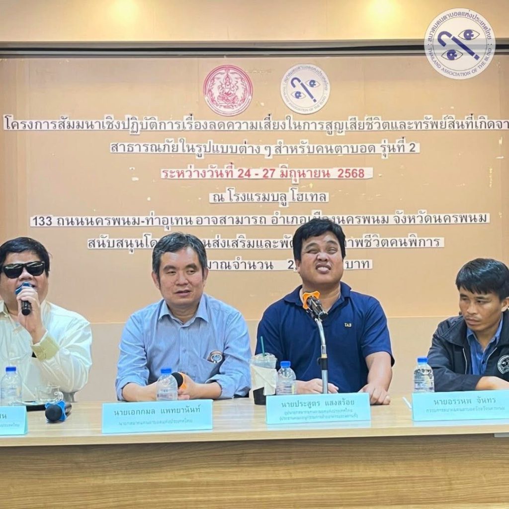 นายเอกกมล แพทยานันท์ นายกสมาคมคนตาบอดแห่งประเทศไทย เดินทางปฏิบัติภารกิจ ณ จังหวัดนครพนม ในโครงการสัมมนาเชิงปฏิบัติการเรื่อง “ลดความเสี่ยงในการสูญเสียชีวิตและทรัพย์สินที่เกิดจากสาธารณภัยในรูปแบบต่าง ๆ สำหรับคนตาบอด รุ่นที่ 2” ซึ่งจัดขึ้นระหว่างวันที่ 24 – 27 มิถุนายน 2568 ณ โรงแรมบลู โฮเต็ล จังหวัดนครพนม โดยมีผู้บริหารสมาคมฯ ระดับชาติ ภูมิภาค และท้องถิ่น รวมถึงหน่วยงานที่เกี่ยวข้องเข้าร่วมอย่างพร้อมเพรียง