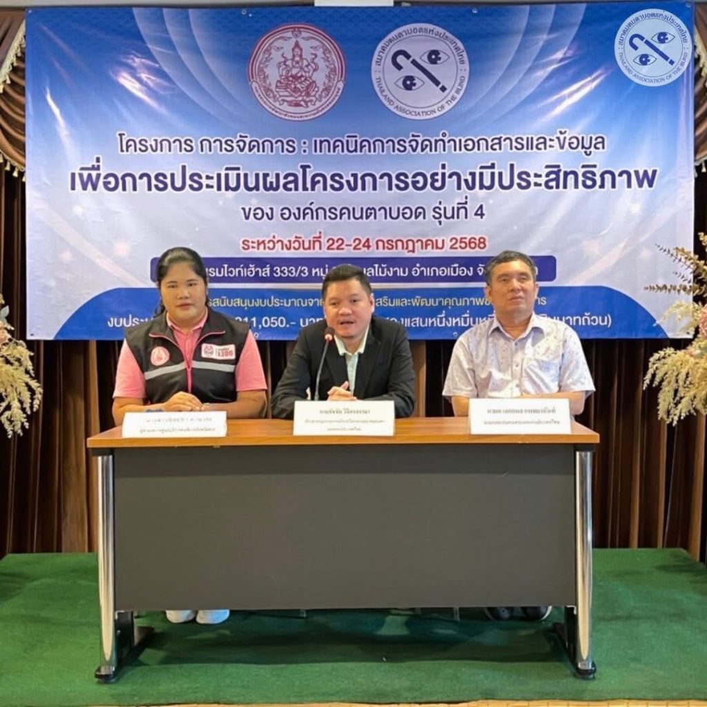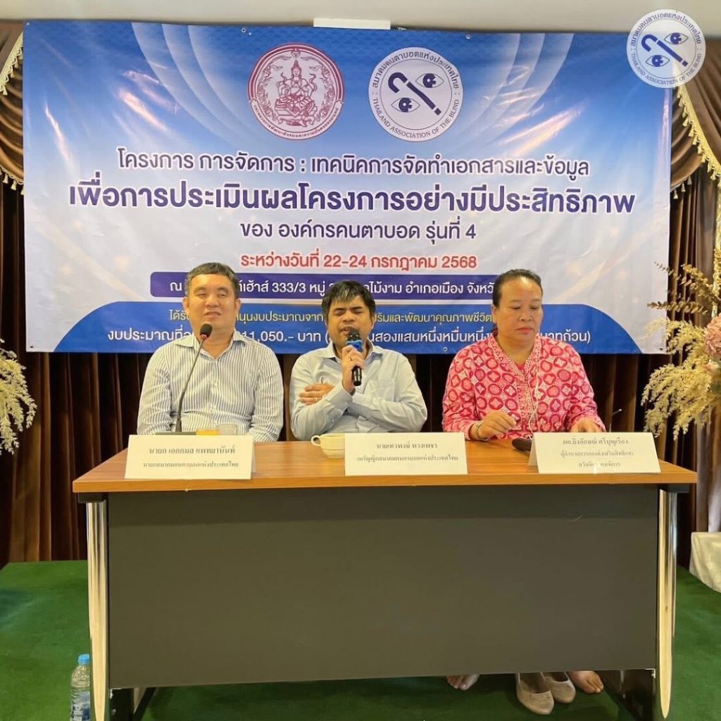 วันที่ 22 – 23 กรกฎาคม 2568 นายเอกกมล แพทยานันท์ นายกสมาคมคนตาบอดแห่งประเทศไทย ร่วมโครงการสัมมนาเชิงปฏิบัติการ “การบริหารจัดการ : เทคนิคการจัดทำเอกสารและข้อมูลเพื่อการประเมินผลโครงการอย่างมีประสิทธิภาพขององค์กรคนตาบอด” รุ่นที่ 4 ณ โรงแรม White House Hotel อำเภอเมืองตาก จังหวัดตาก