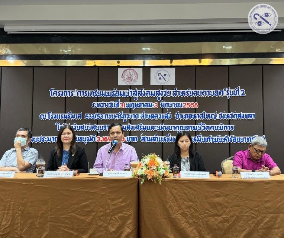 สมาคมคนตาบอดแห่งประเทศไทย โดย คณะอนุกรรมการกิจการเด็ก เยาวชน สตรี ผู้สูงอายุ และผู้มีความหลากหลายทางเพศตาบอด จัดโครงการ “การเตรียมความพร้อมเข้าสู่สังคมสูงวัยสำหรับคนตาบอด” รุ่นที่ 2 ระหว่างวันที่ 31 พฤษภาคม – 3 มิถุนายน 2568 ณ โรงแรมรีมาส อ.หาดใหญ่ จ.สงขลา