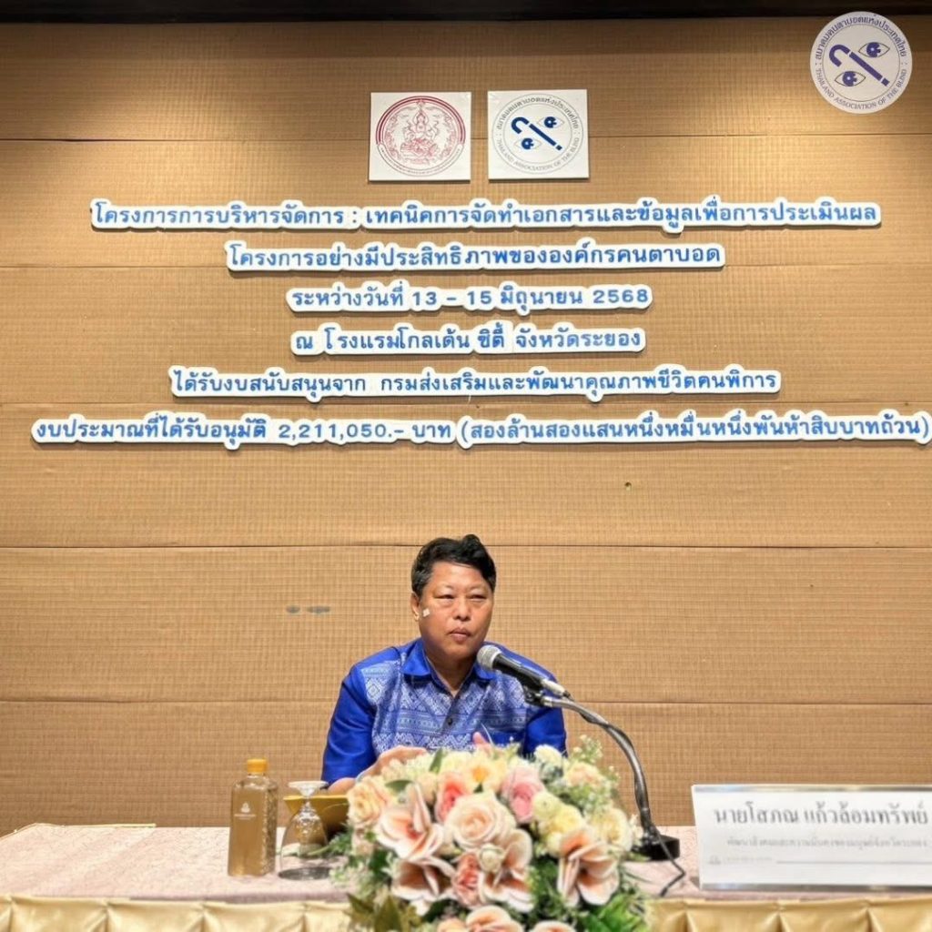 สมาคมคนตาบอดแห่งประเทศไทย จัดโครงการ “การบริหารจัดการเทคนิคการจัดทำเอกสารและข้อมูลเพื่อการประเมินผลโครงการอย่างมีประสิทธิภาพขององค์กรคนตาบอด” รุ่นที่ 1 ระหว่างวันที่ 13 – 15 มิถุนายน 2568 ณ โรงแรมโกลเด้นซิตี้ระยอง จังหวัดระยอง เพื่อส่งเสริมให้ผู้แทนองค์กรคนตาบอดมีความรู้ความเข้าใจเกี่ยวกับหลักเกณฑ์ ระเบียบ ข้อบังคับ และกระบวนการติดตามประเมินผลโครงการของกองทุนฯ อย่างถูกต้องและครบถ้วน พร้อมทั้งพัฒนาทักษะด้านการจัดทำเอกสารและข้อมูลที่จำเป็นให้เป็นไปตามมาตรฐาน เพิ่มประสิทธิภาพในการบริหารจัดการโครงการ และสร้างความมั่นใจในการเตรียมพร้อมรับการประเมินผล