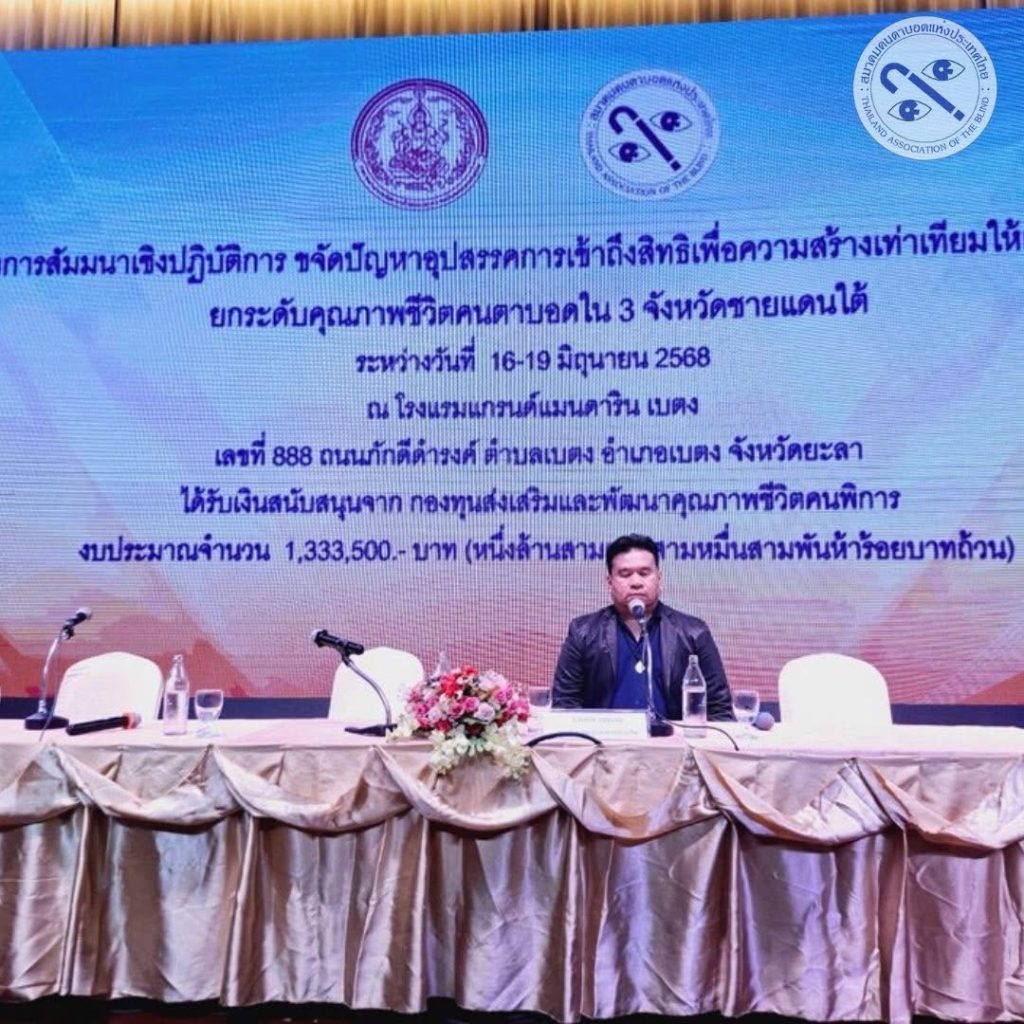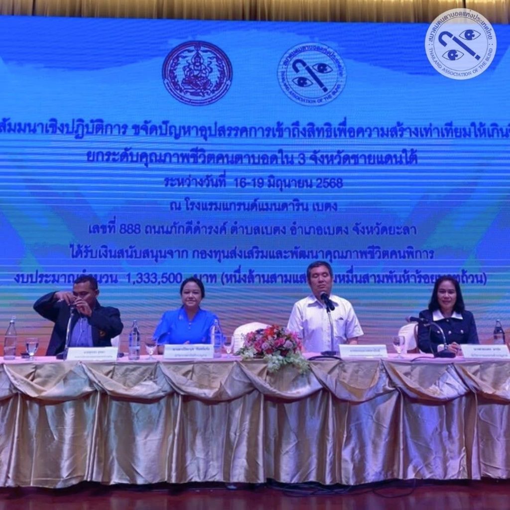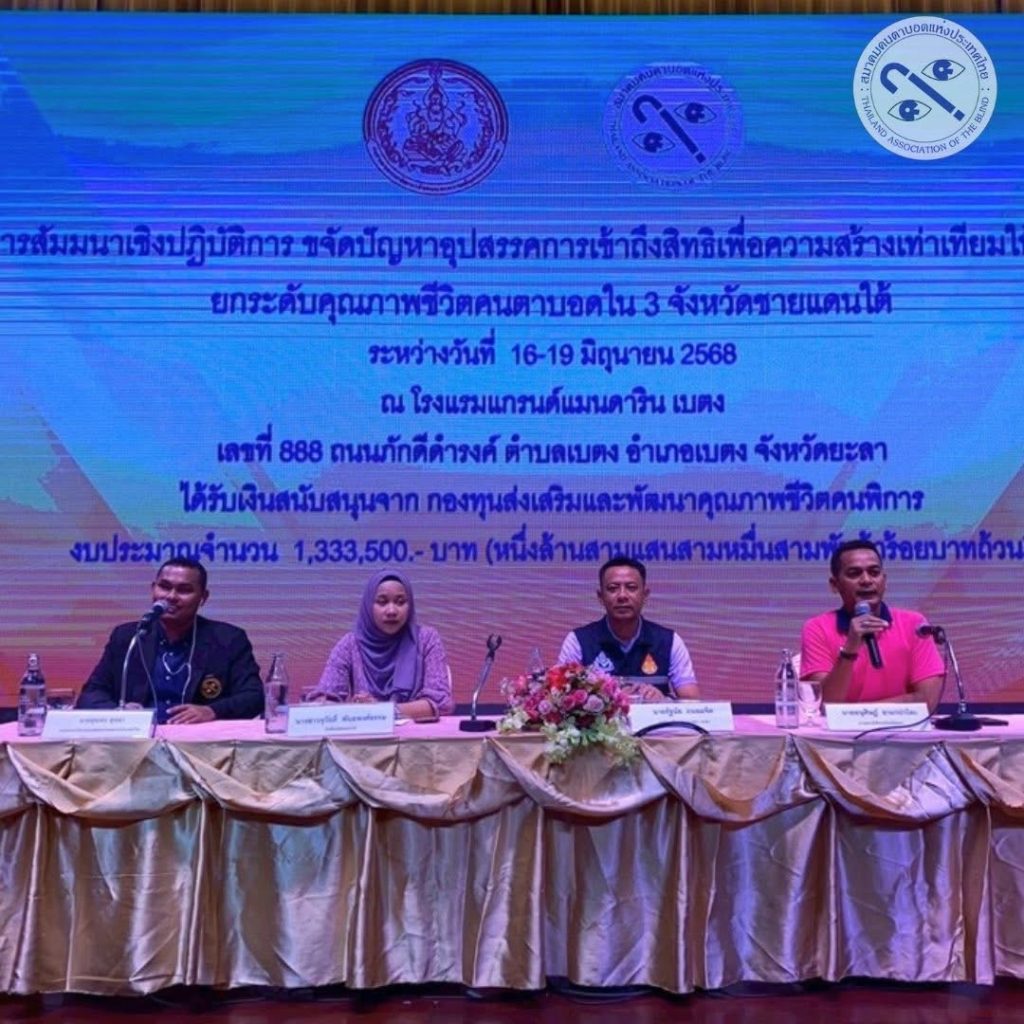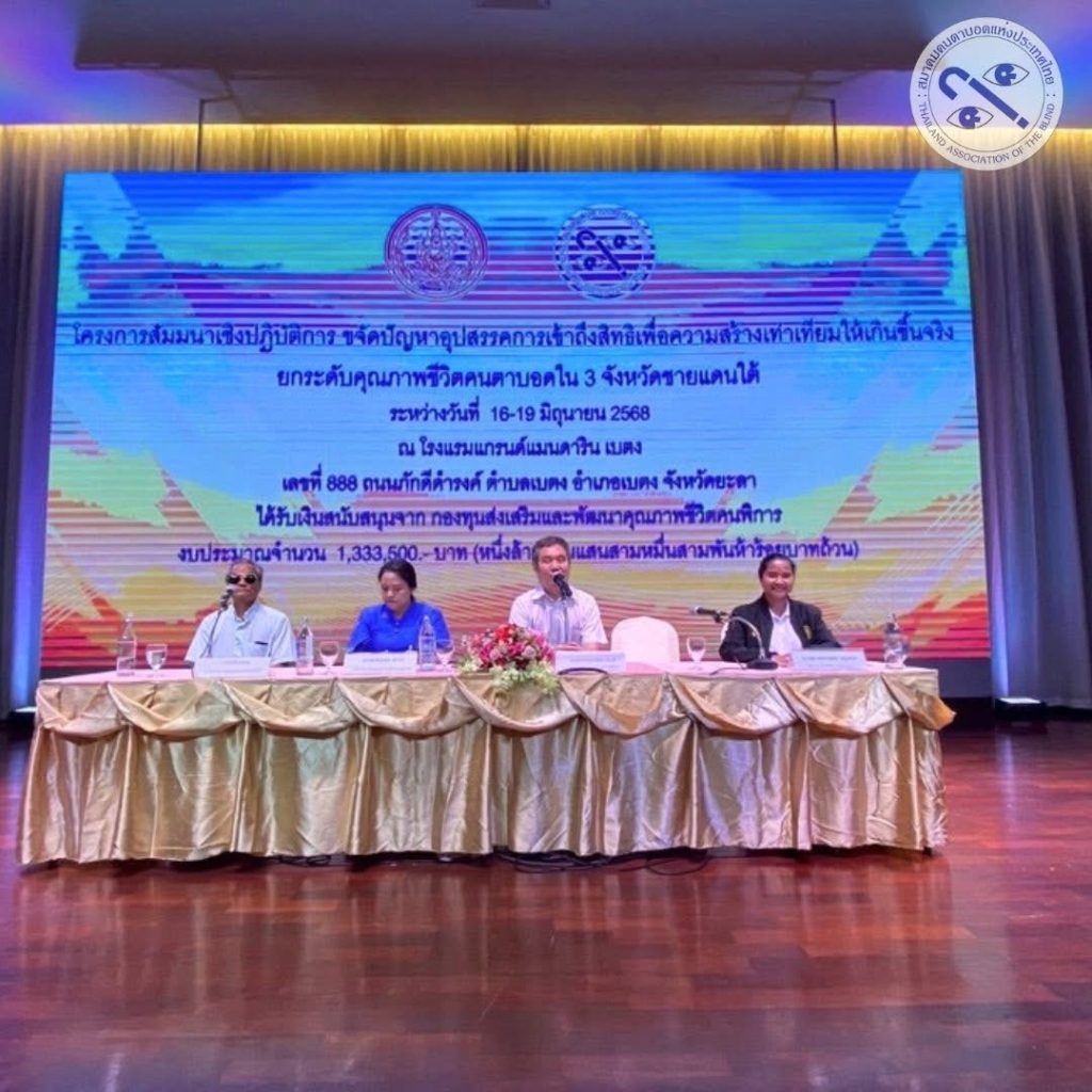 เพื่อให้คนตาบอด ญาติ ตระหนักถึงปัญหาการเข้าถึงสิทธิ มีความรู้ความเข้าใจเรื่องสิทธิภายใต้กฎหมาย สามารถเข้าถึงสิทธิได้อย่างเท่าเทียมและเพื่อให้เกิดเครือข่ายความร่วมมือขององค์กรคนตาบอดหน่วยงานภาครัฐ เอกชน และองค์กรปกครองส่วยท้องถิ่น ในการแก้ปัญหาการเข้าถึงสิทธิของคนตาบอด ใน 3 จังหวัดชายแดนภาคใต้