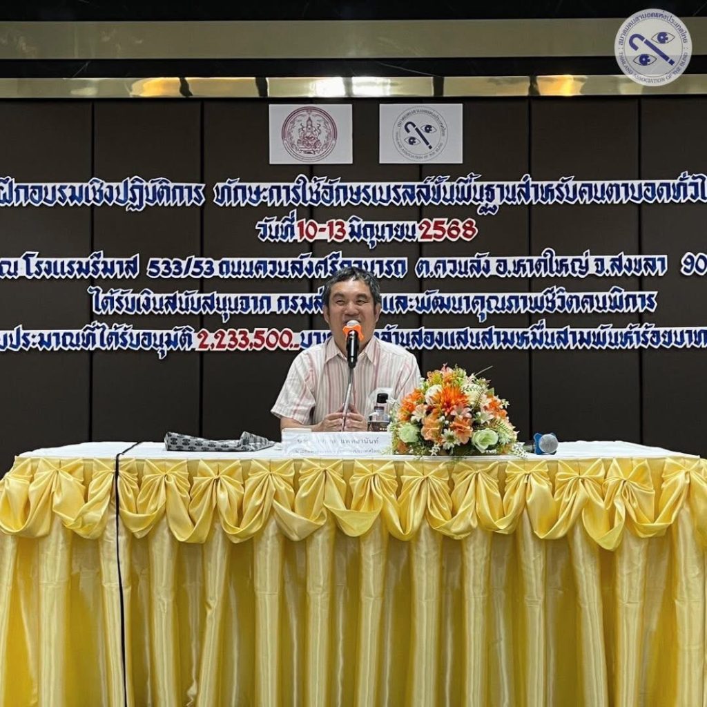 สมาคมคนตาบอดแห่งประเทศไทย โดยกองทุนส่งเสริมและพัฒนาการใช้อักษรเบรลล์แห่งชาติ จัดโครงการ “ฝึกอบรมปฏิบัติการทักษะการใช้อักษรเบรลล์ขั้นพื้นฐานสำหรับคนตาบอดทั่วไป รุ่นที่ 3” ระหว่างวันที่ 21 – 24 มิถุนายน 2568 ณ โรงแรมแกรนด์ ปา แอนด์ รีสอร์ท จังหวัดลำพูน โครงการนี้มีเป้าหมายเพื่อเสริมสร้างความเข้าใจและพัฒนาทักษะการใช้อักษรเบรลล์ ซึ่งเป็นเครื่องมือสำคัญในการเข้าถึงการศึกษา การทำงาน และการดำรงชีวิตประจำวันของคนตาบอด อักษรเบรลล์จึงเปรียบเสมือนสะพานเชื่อมโยงไปสู่ข้อมูล ข่าวสาร และโอกาสต่าง ๆ ที่จะนำไปสู่คุณภาพชีวิตที่ดีขึ้นอย่างเท่าเทียม พิธีเปิดโครงการได้รับเกียรติจากนายศักรินทร์ ปานกลาง ผู้อำนวยการศูนย์บริการคนพิการจังหวัดลำพูน เป็นประธานในพิธี และนายเทวพงษ์ พวงเพชร ประธานกองทุนส่งเสริมและพัฒนาการใช้อักษรเบรลล์แห่งชาติ เป็นผู้กล่าวรายงาน โครงการฝึกอบรมครั้งนี้เป็นหนึ่งในจำนวนทั้งหมด 5 รุ่น ซึ่งครอบคลุมพื้นที่ทุกภูมิภาคของประเทศไทย โดยได้รับการสนับสนุนจากกองทุนส่งเสริมและพัฒนาคุณภาพชีวิตคนพิการ กระทรวงการพัฒนาสังคมและความมั่นคงของมนุษย์